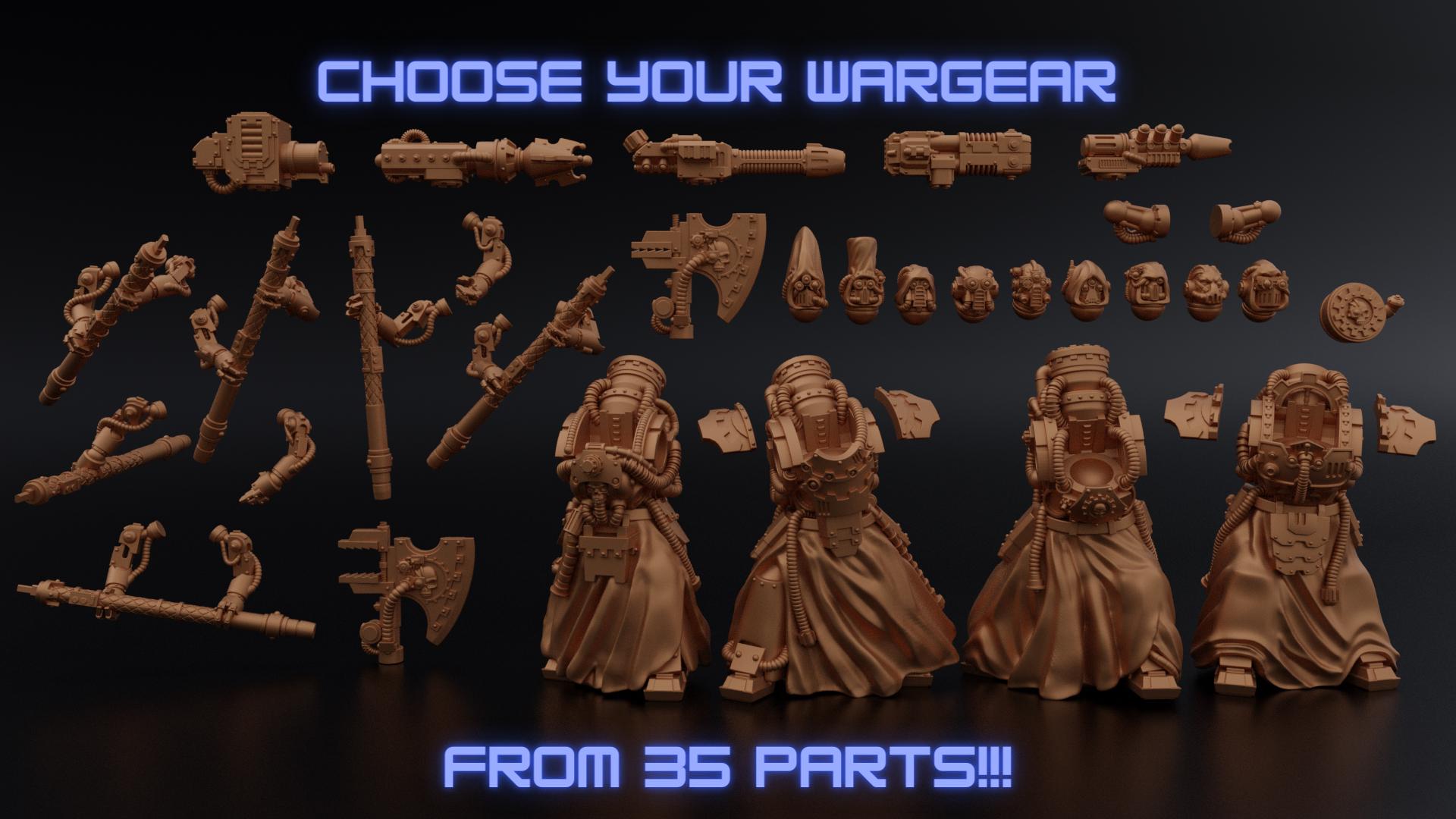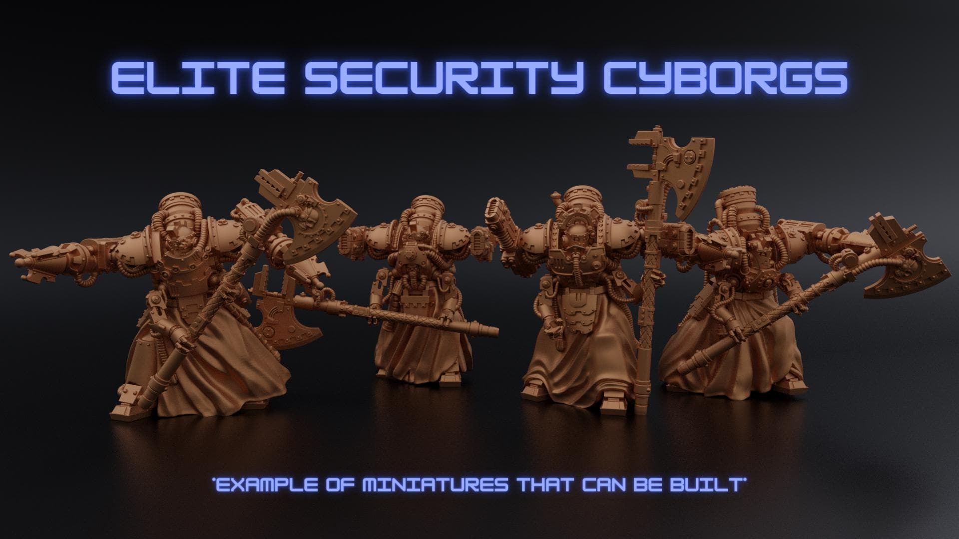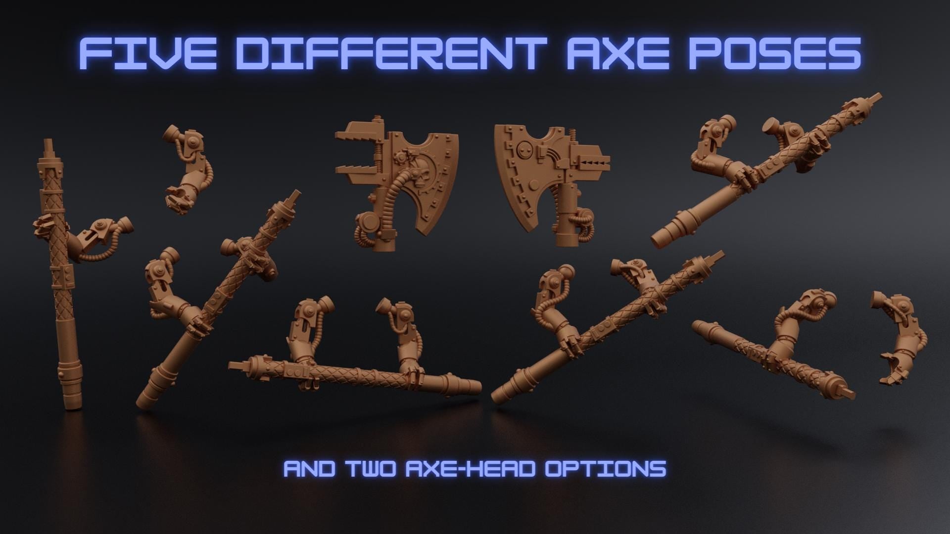 Full Kit - This listing is for 3 Security Cyborgs, each armed with an Axe and Shoulder Mounted Guns. Included are an extra 2 arm poses, 9 heads, 3 alternative axe heads and 3 pairs of each shoulder guns (Maxim, Plasma, Gravy)
